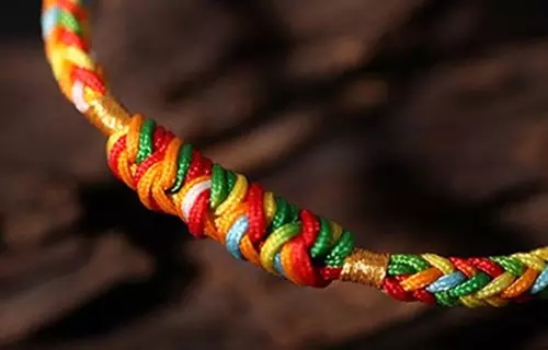 簡單的以五色絲線合股成繩,系于臂膀;在五彩繩上綴飾金錫飾物,掛于項(xiàng)頸;五彩繩折成方勝,飾于胸前;五彩繩結(jié)為人像戴之;以五彩絲線繡繪日月星辰烏獸等物,敬獻(xiàn)尊長。此俗始于漢代。